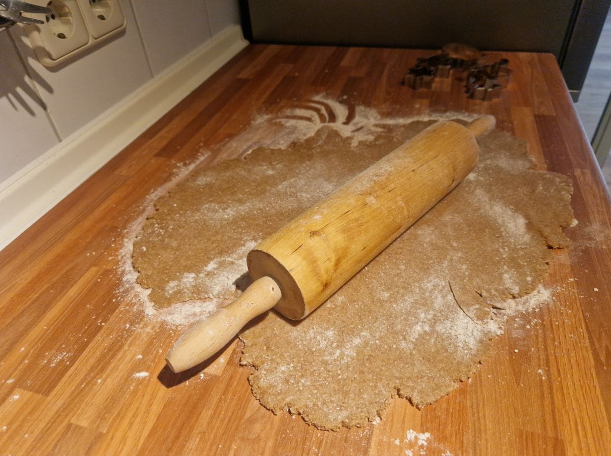 - Bemehle im nächsten Schritt die Arbeitsoberfläche und dein Nudelholz, damit der Teig nicht kleben bleibt. Solltest du kein Nudelholz besitzen, kann auch eine Glasflasche oder ein Glas als Ersatz dienen. Der ausgerollte Teig sollte ungefähr 3 mm dick sein, bevor du mit deinen Lieblingsformen mit dem Ausstechen beginnst.