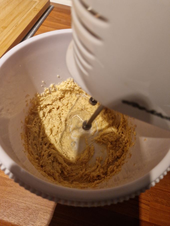 1. Gib die Margarine und den Rohrzucker in eine Schüssel und rühre anschließend mit einem Handrührgerät oder einer Küchenmaschine die Mischung schaumig. Sobald die Masse eine luftige Konsistenz hat, ist sie perfekt für die weitere Verarbeitung.