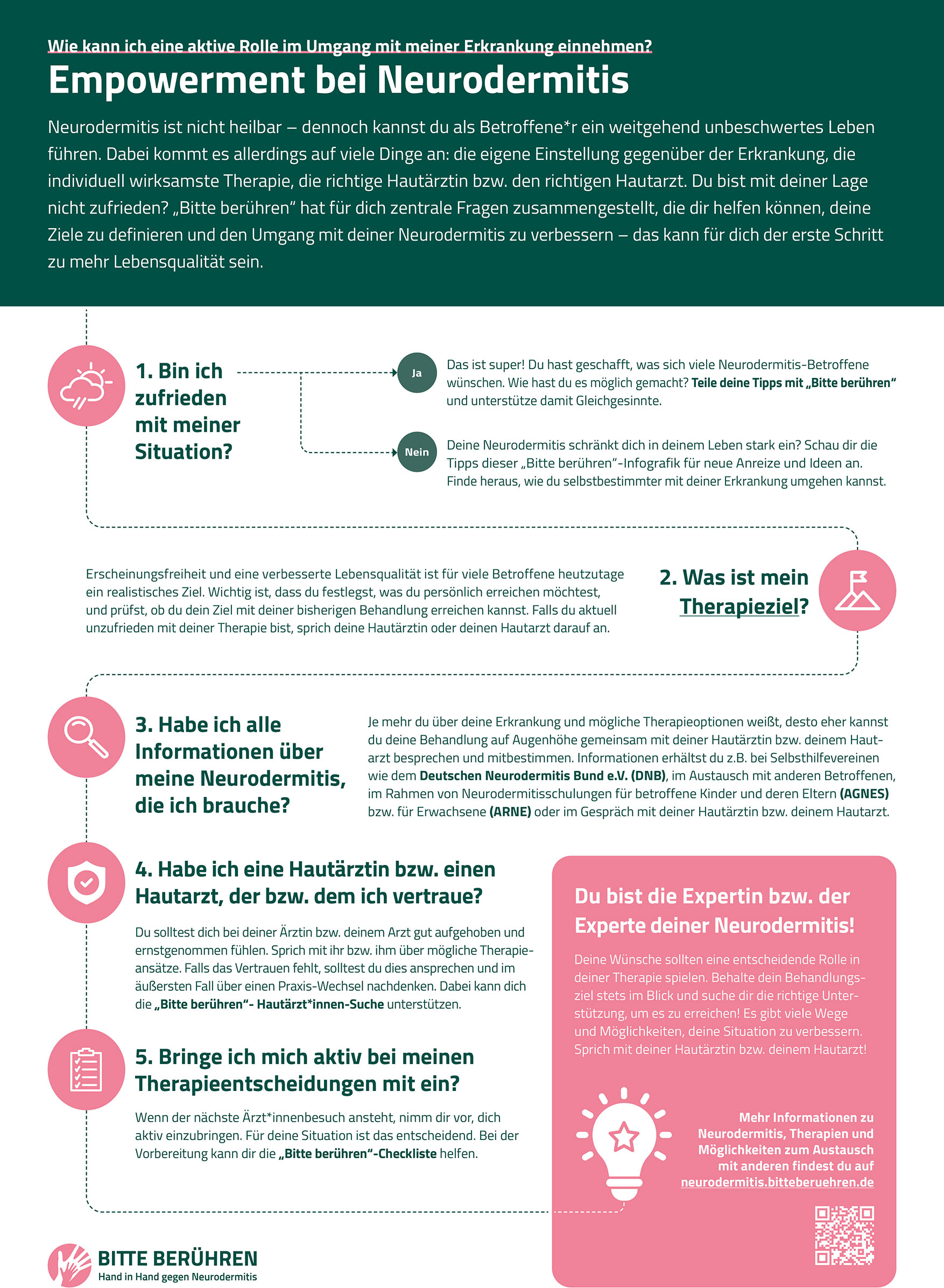 Du bist mit deiner Lage nicht zufrieden? „Bitte berühren“ hat für dich zentrale Fragen zusammengestellt, die dir helfen können, deine Ziele zu definieren und den Umgang mit deiner Neurodermitis zu verbessern – das kann für dich der erste Schritt zu mehr Lebensqualität sein.